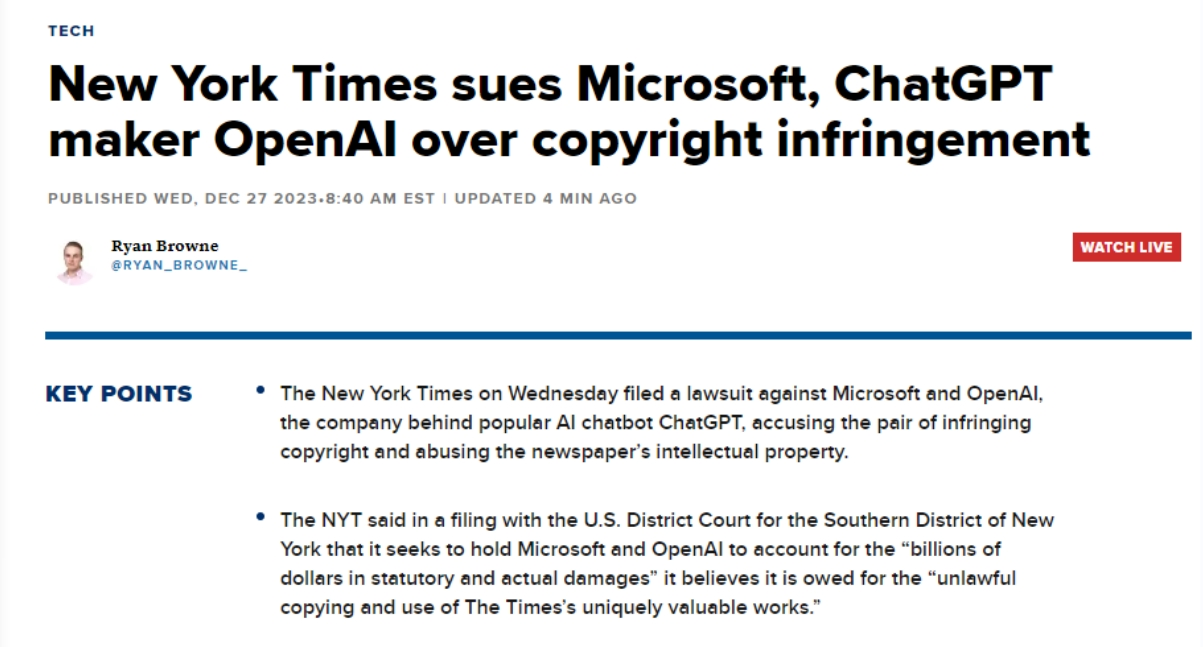 其认识到生成式AI对和旧事业的影响力和潜力,微软和OpenAI的AI模子损害了旧事内容和将内容变现的能力,此中,由于他们认为这些材料具有靠得住性和精确性。例如,《纽约时报》是第一家告状这两家公司其文字做品版权的美国大型机构!